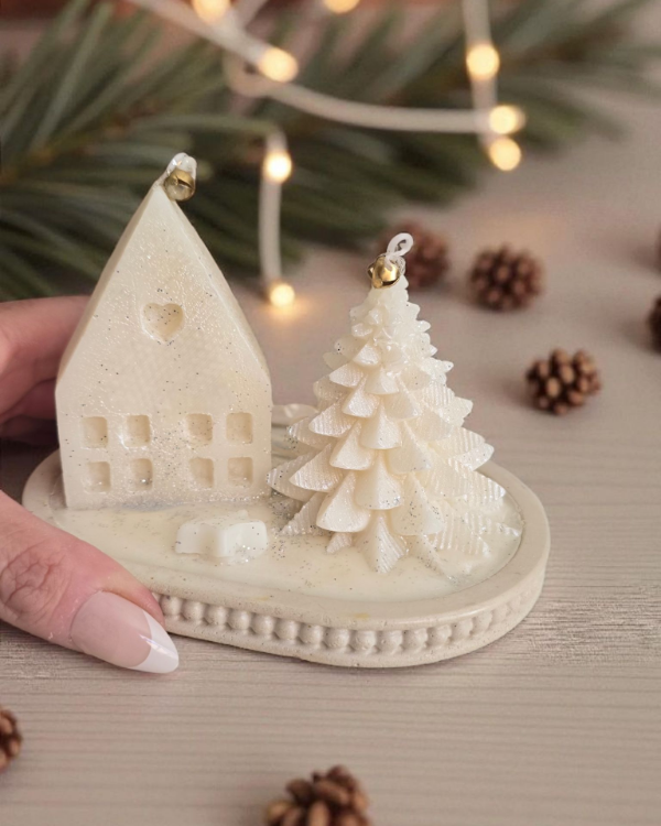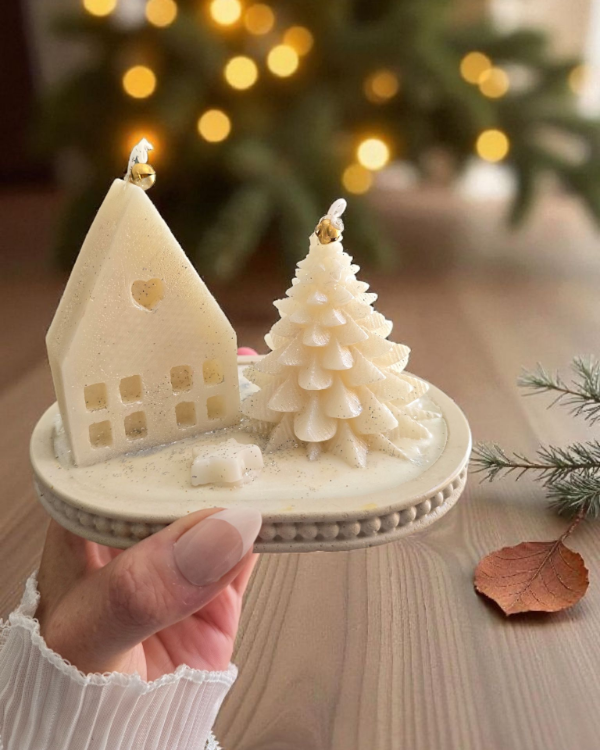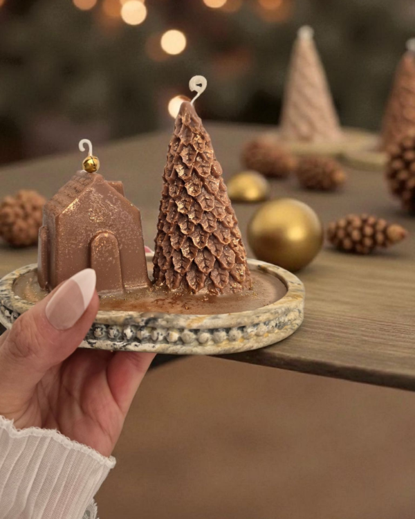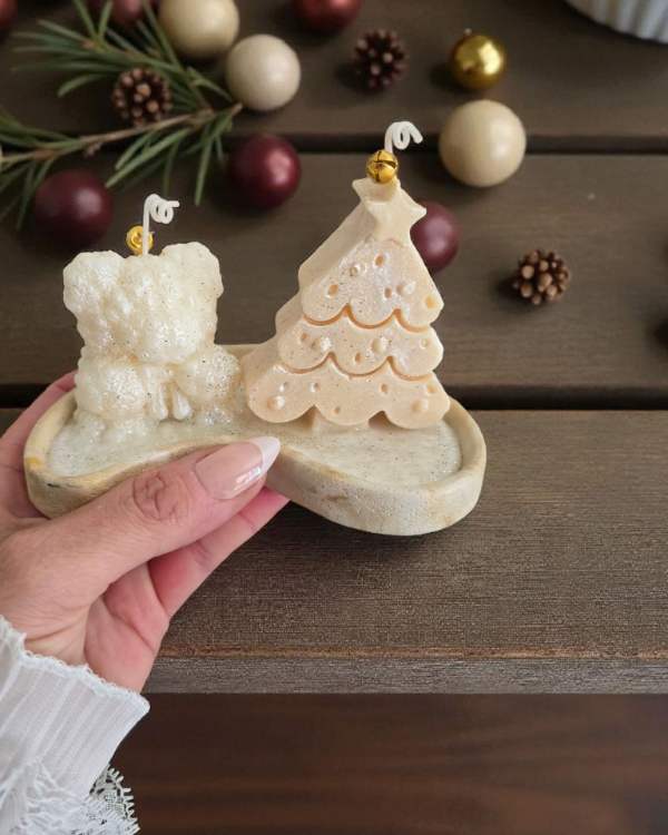 Dos velas aromáticas en soja insertas en bandejita decorativa de concreto.