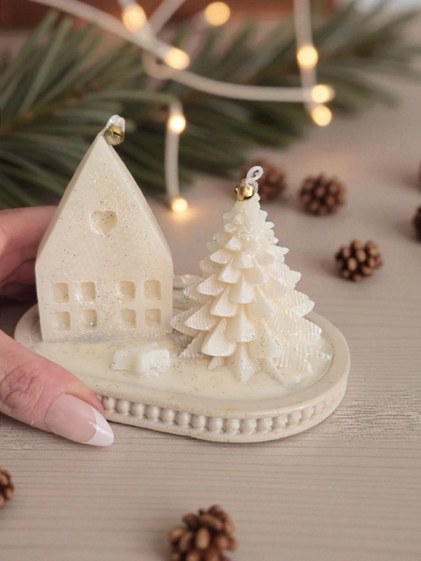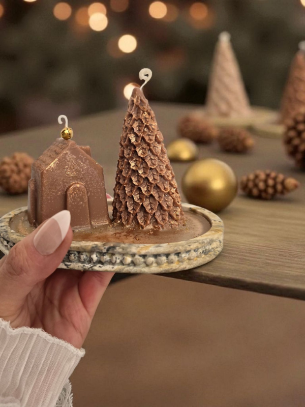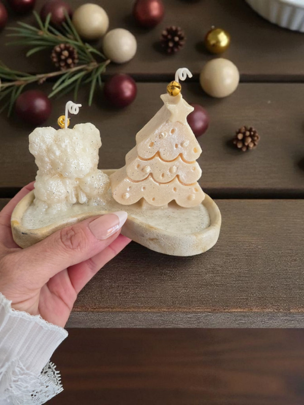 Velas aromáticas en soja insertas en bandejita decorativa de concreto.