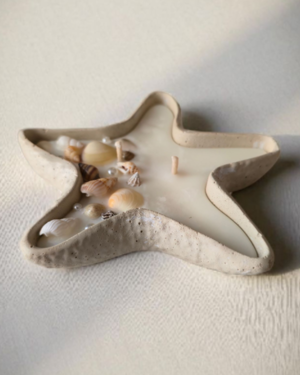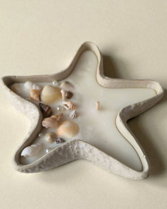 Vela de soja aromatizada en cotenedor de concreto polimérico con inclusiones de pequeños caracoles. .