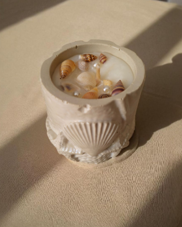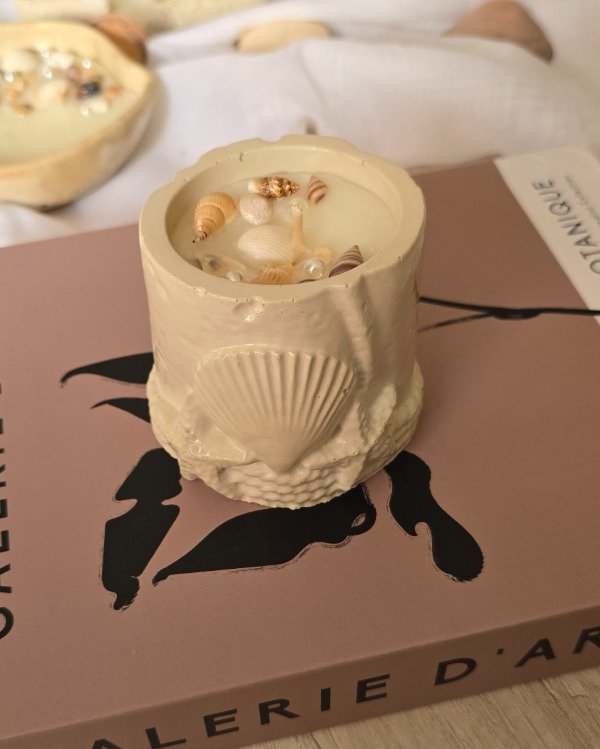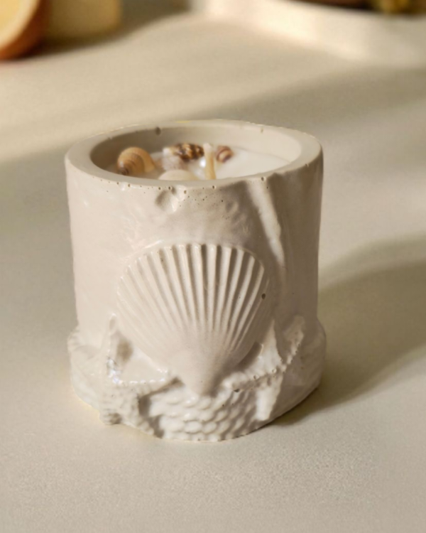 Vela de soja aromatizada en cotenedor de concreto polimérico con inclusiones de motivos marinos.
